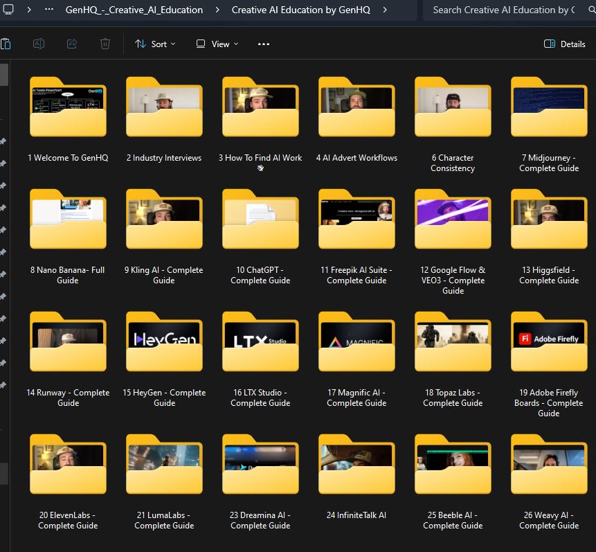 The Creative AI Education by GenHQ program is structured into comprehensive modules designed to provide a practical and actionable learning experience. Each module focuses on a specific skill or toolset, building upon the knowledge gained in previous lessons. Some of the key modules include: