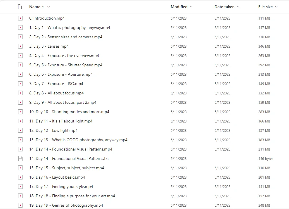 The Pat Kay 30 Day Photography Fundamentals Accelerator is divided into daily modules that build upon each other, providing a logical and efficient learning experience. Each day includes: