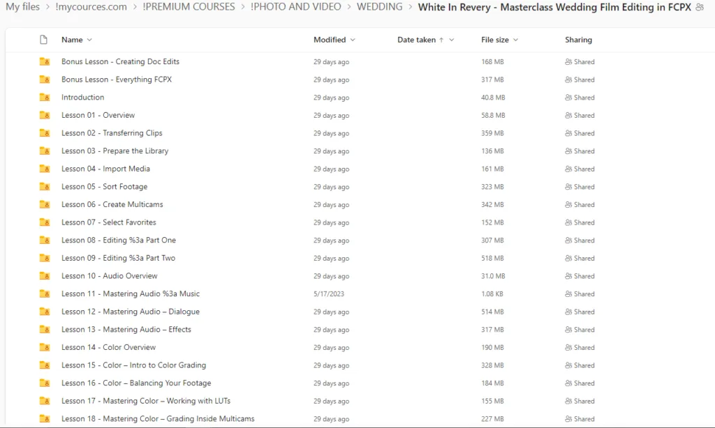 The course is divided into comprehensive modules, each focusing on a specific aspect of wedding film editing. Here’s a detailed breakdown of the lessons included in the White In Revery Masterclass Wedding Film Editing in FCPX: